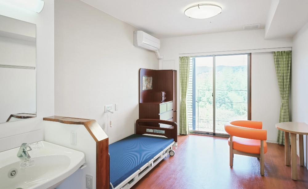 ユニット型老健なので、お一人おひとりがプライベートな空間での暮らしを確保できます。約15㎡の居室は冷暖房完備、電動ベッド、鍵付棚を備えたタンス、机、あぐら椅子も備え付けています。居室の洗面台は高さ調整が可能で、車いすの方でも過ごしやすい環境です。